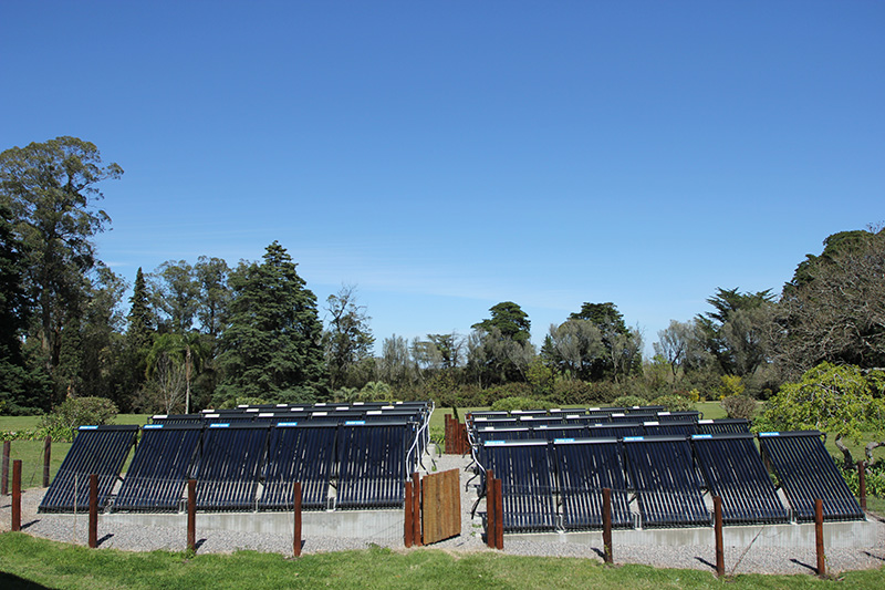 Suministro e instalación de paneles solares tipo Heat Pipe de 15 tubos (superficie de capacitación total instalada: 80 m2) El sistema alimenta la piscina cerrada del hotel.